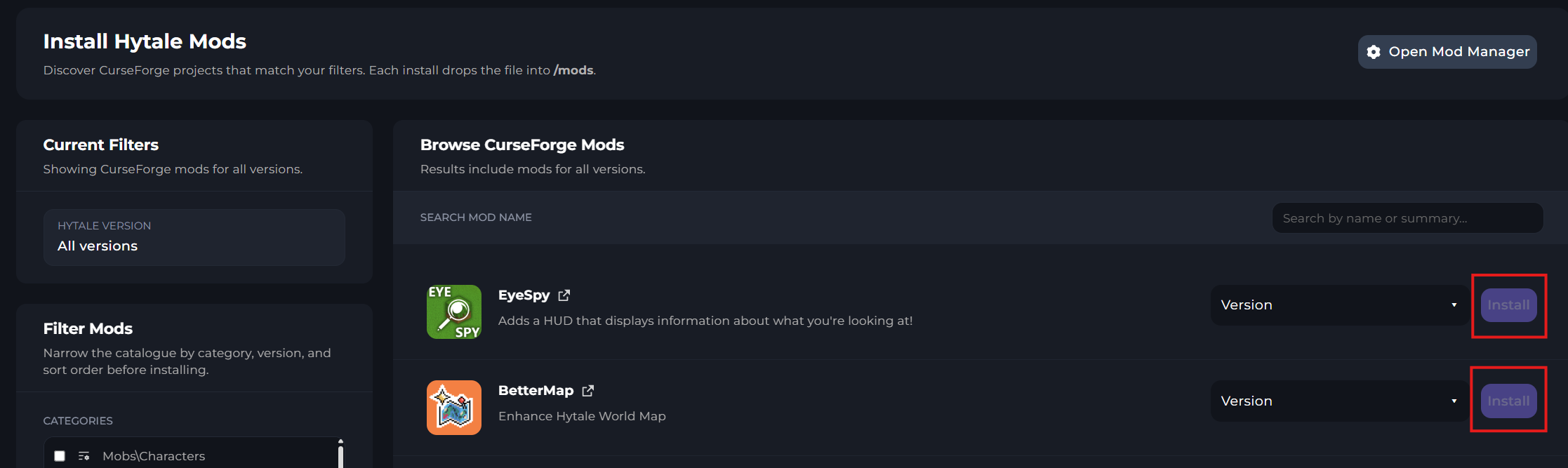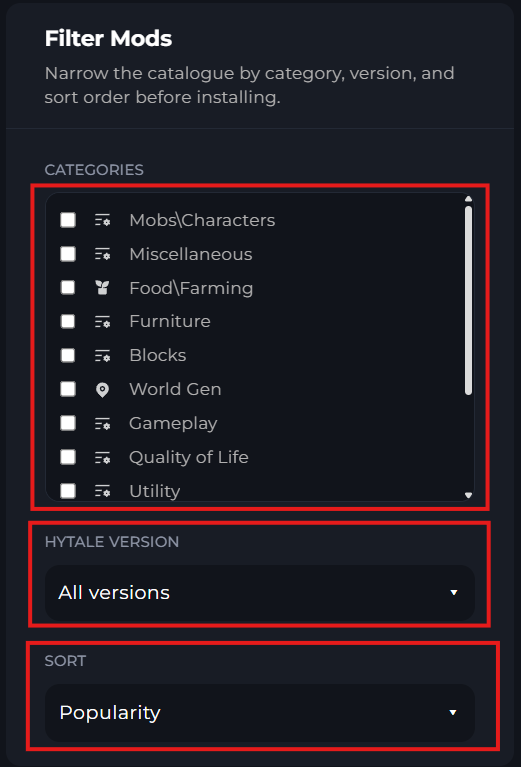 In the Mod Installer Menu, you'll have the option to search for mods you'd like to install. You'll also be able to use the "Filter" feature to find mod categories you're interested in.