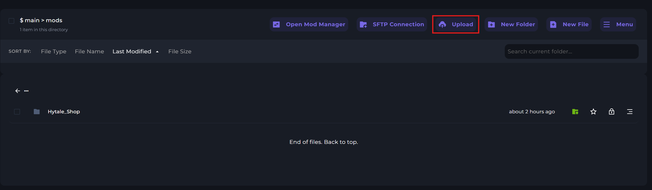 To upload mods to your server head to the file manager. In here you'll find a folder called mods. All mods should be a jar or zip folder, don't unarchive the zips, keep them as zip files. Once you've uploaded all your files, reboot the server.