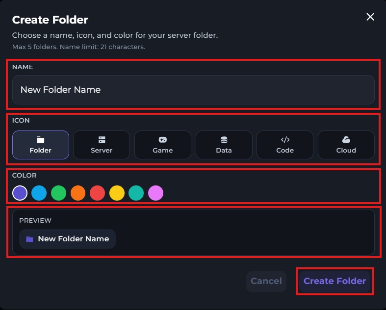 You'll then be met with a pop-up, where you can set the name for the folder, change it's icon, change it's color, and see it's preview.
