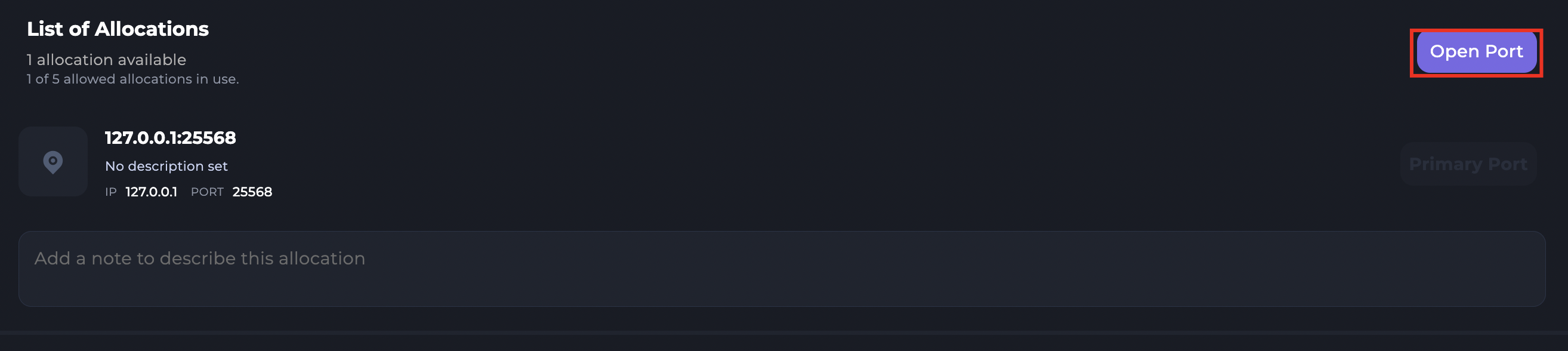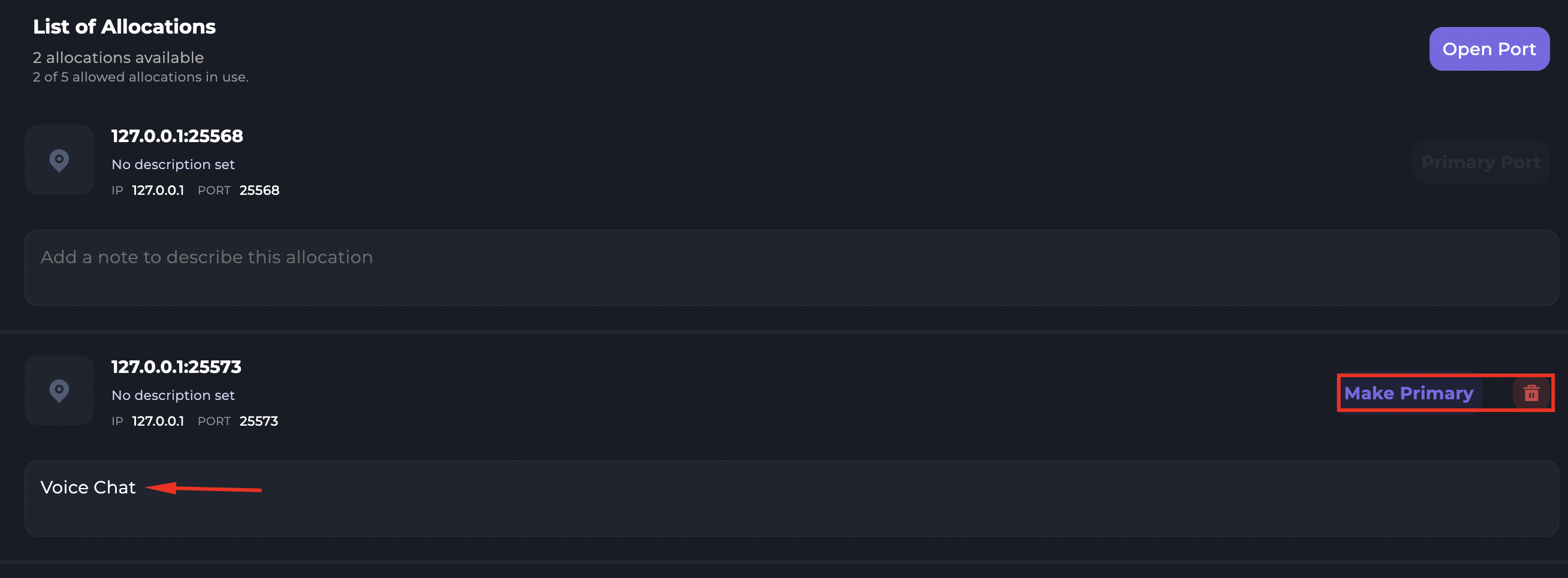 4 You will now see a new port that was created, you will be able to add a Note within the port, which you can use to remember what the port is used for. You can also make the Port the Primary port on your server & delete it if you find that you no longer need it.