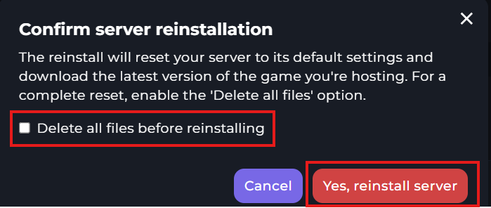 You'll then be met with this menu. If you wish to wipe your server completely, you will need to check the box that states "Delete all files before reinstalling". However, if you only wish to switch your server back to its original settings and wish to keep your other files, you won't need to check this box. Once you've made your decision, click "Yes, reinstall server"
