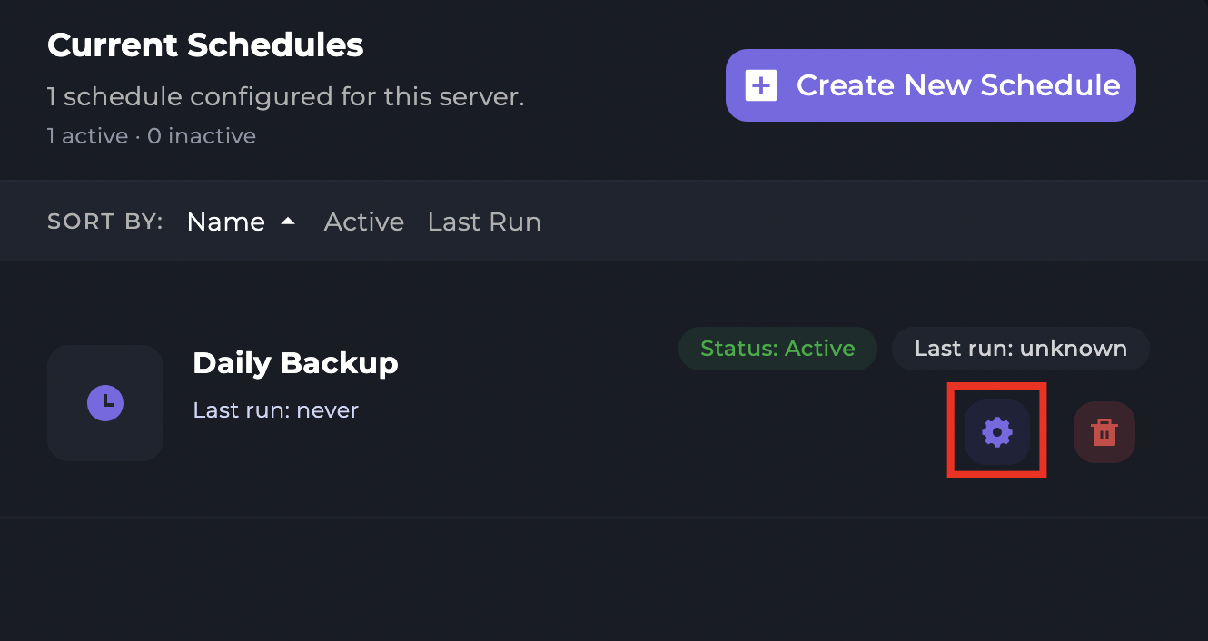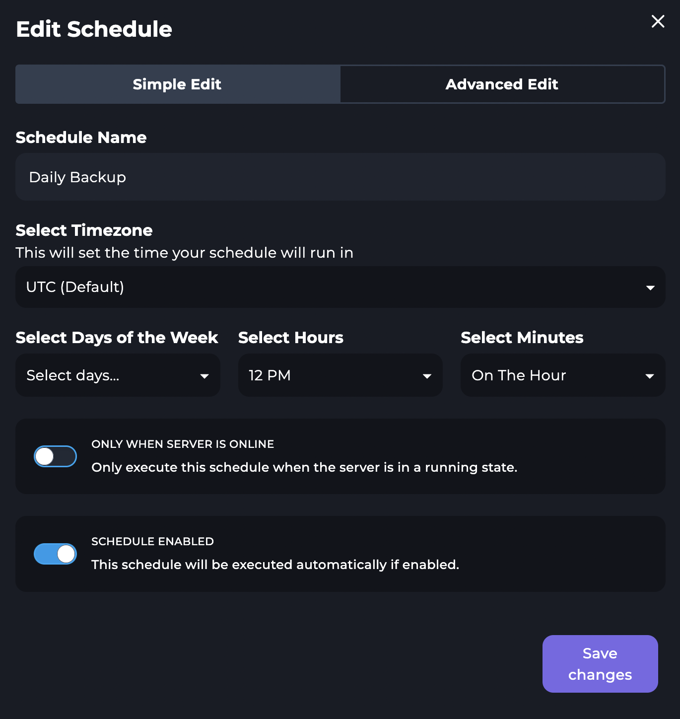 Schedules are a powerful tool that allows you to automatically run actions on your server. This could be a backup, restart, or a command. We support two different types of creating a schedule, the Simple mode & the Advanced mode.