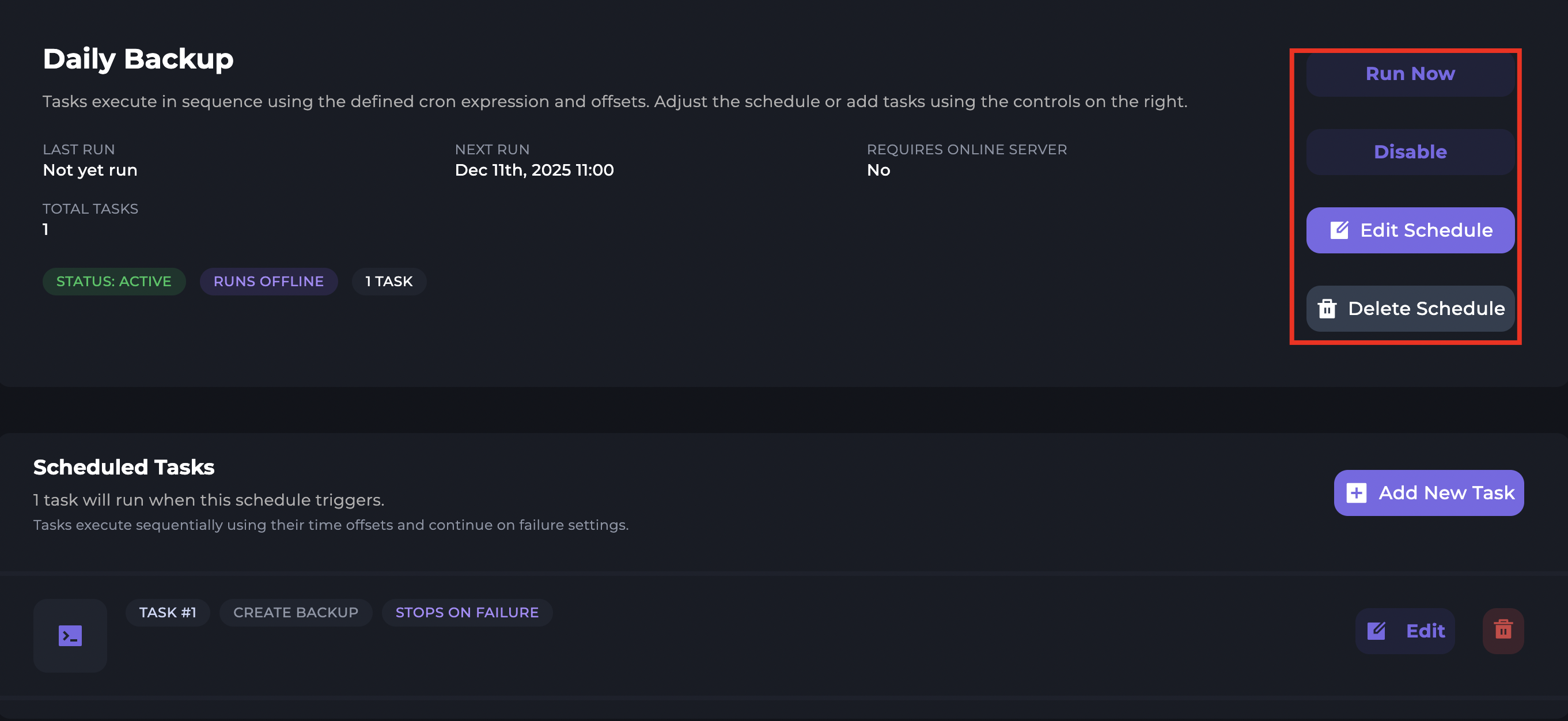 You will see a variety of different options you can choose from, Like running your schedule instantly, Disabling, Editing & Deleting the schedule.