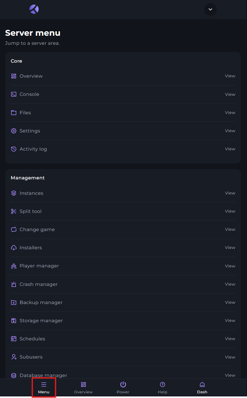 In the menu, you'll have access to all your servers files, the console, settings, and so on. All the available choices are listed, and you'll be able to scroll down for more.