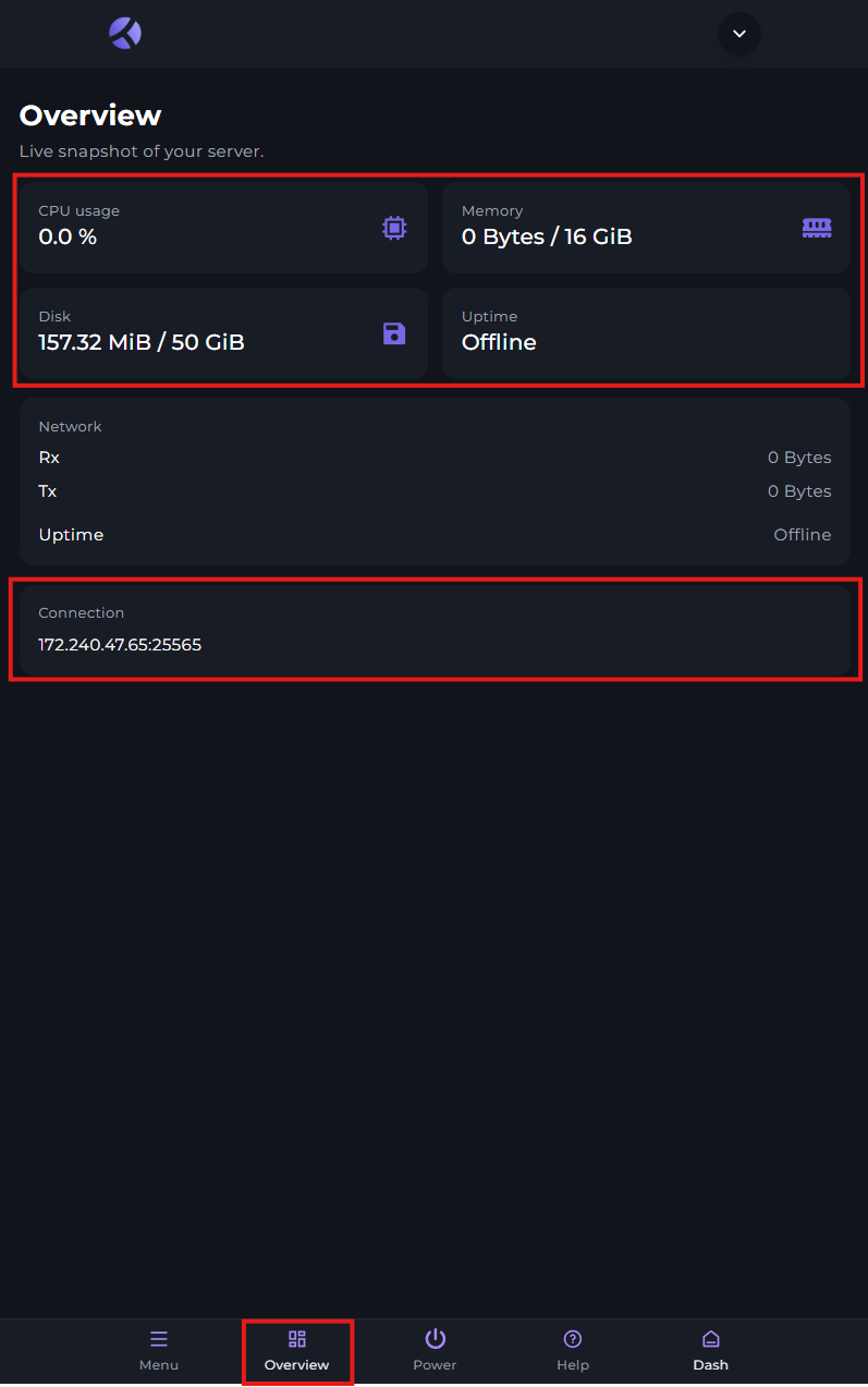 In the overview page, you'll be able to view your servers CPU usage, RAM usuage, disk usage, and uptime status.