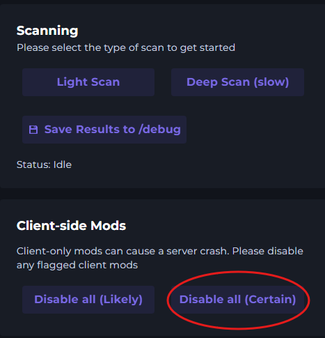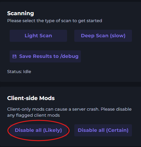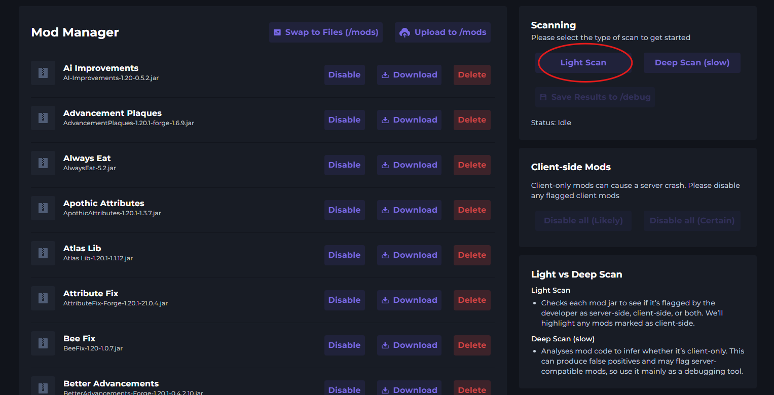The Mod Manager provides a friendly UI that lets you manage your mods. It also offers features such as mod scanning to remove possible client-side mods.
