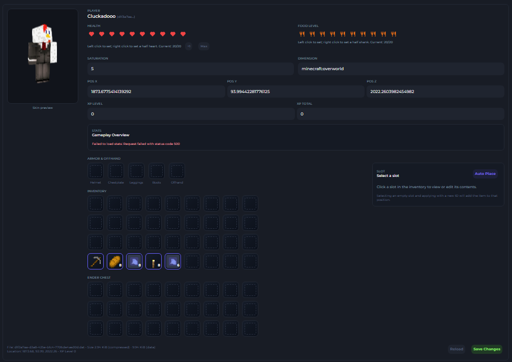 The player data tool will allow you to modify a user's data, including health, Cords, and Inventory Manager