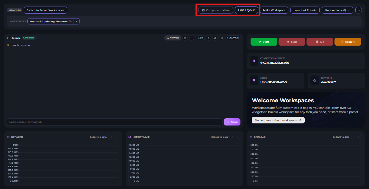 You will see the default layout in the beginning, click on the "Edit Layout" to start editing the workspace to your liking. From there you can drag, resize, add, and remove Components in the layout and from the Component Menu.