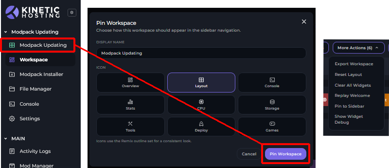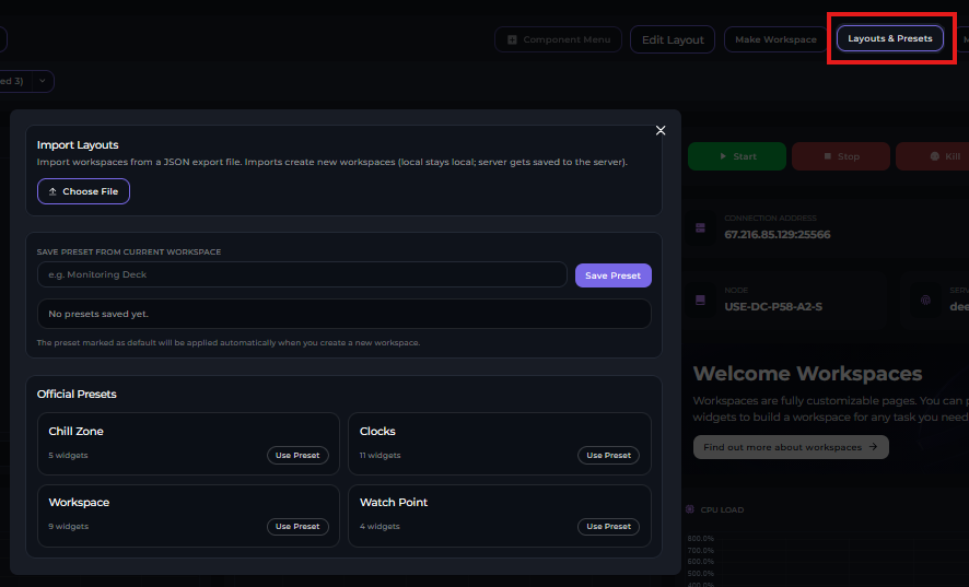 In the top right there is a "More Actions" Button, here it will allow you to Export your workspaces to share to other people, Replay the welcome screen (First Time Setup), Reset to the default layout/Clear all the widgets, and pin the workspace to the sidebar on the left.