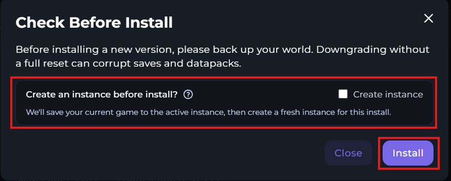 6 You'll be met with a menu asking if you'd like to create an instance. An instance is similar to a backup. This will allow you to roll back to your server if something goes wrong during the installation.