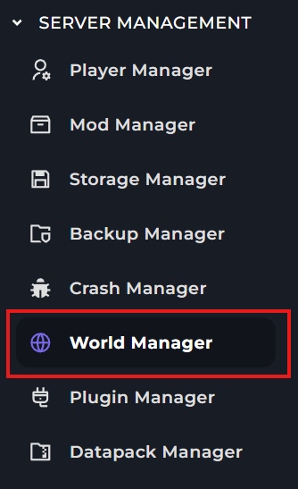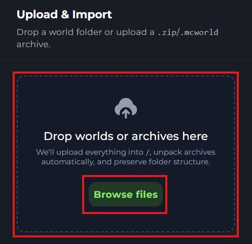 On the left hand side of the world manager menu, you'll need to upload your world file or your zipped world file into the world manager by either dragging and dropping file into the upload box, you by clicking "Browse files" to select the file.