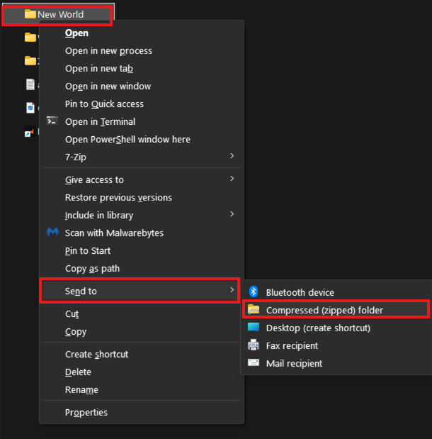 If you're using Windows. Right-click on the world folder (Shift and right-click if on Windows 11), press send to, then Zip folder.
