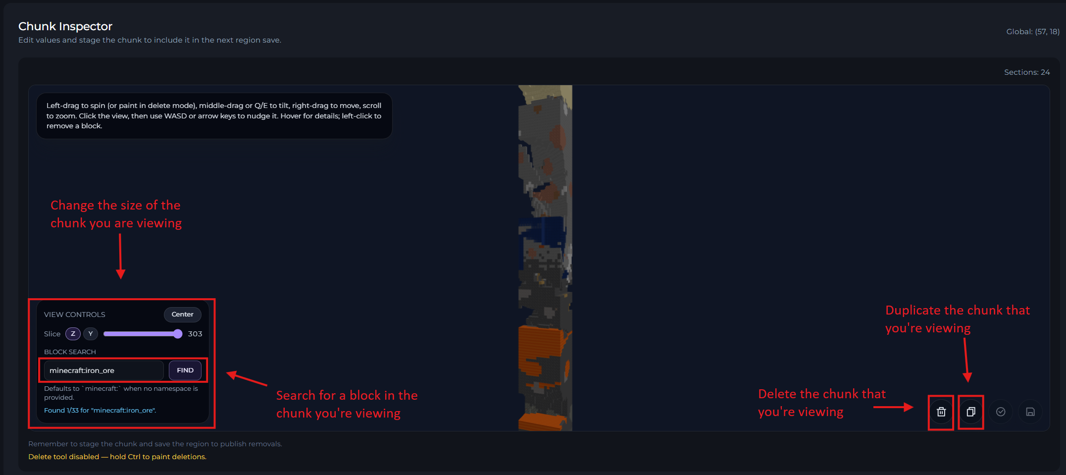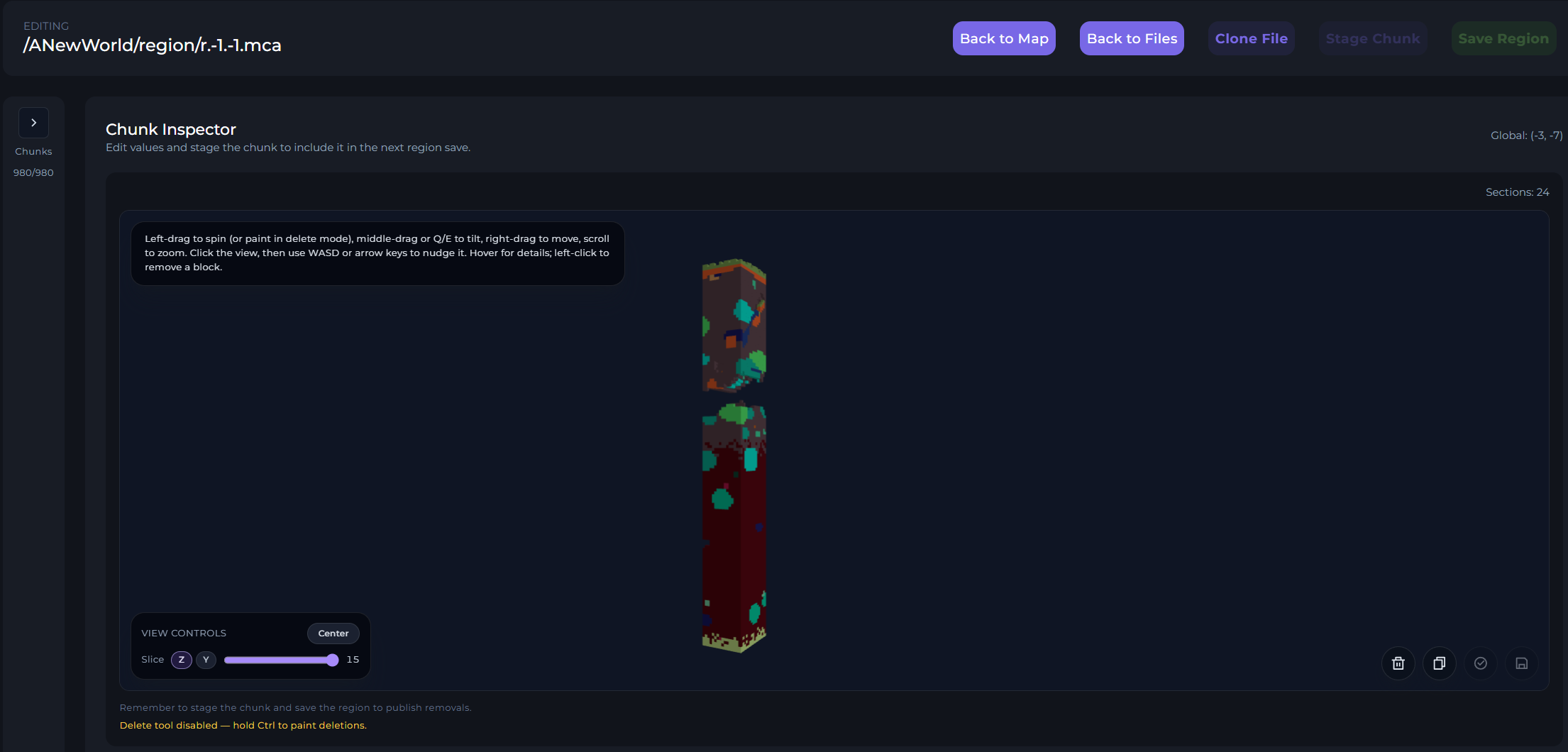 Once you've selected the chunk, you'll then see the 3D Chunk View menu. In this menu, you can zoom in and out, and move the chunk around to see what it's contents are.