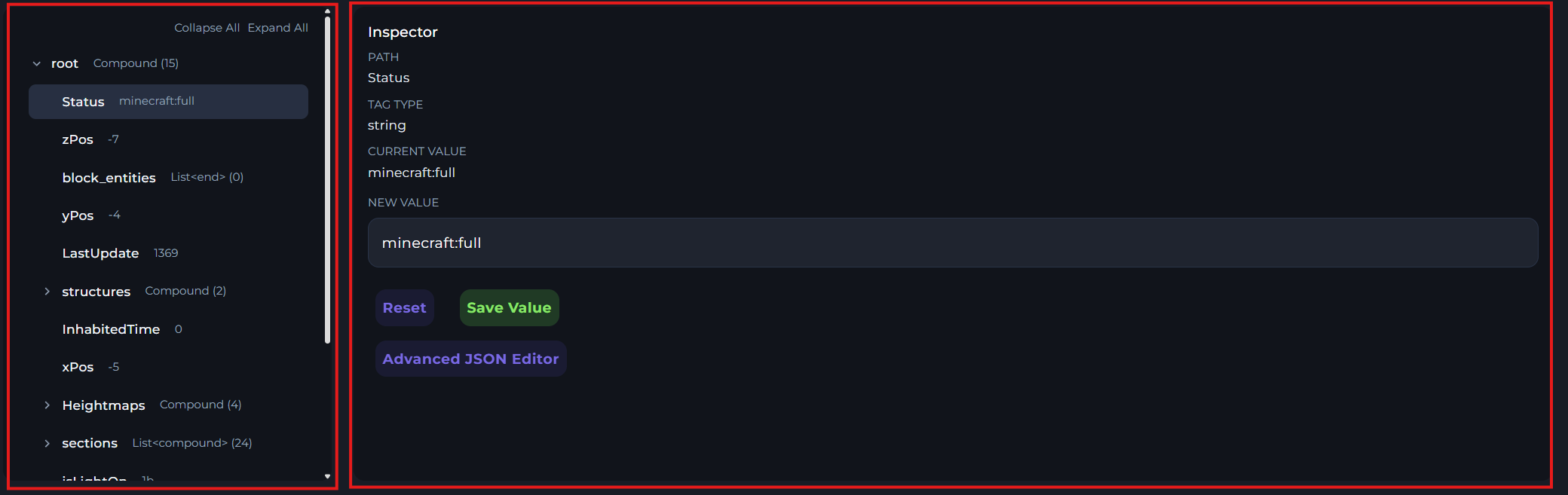 If you scroll down a bit, you'll find the inspector section. Which will provide you with information about the contents of the chunk, such as entities.