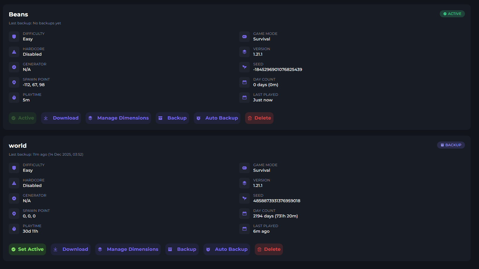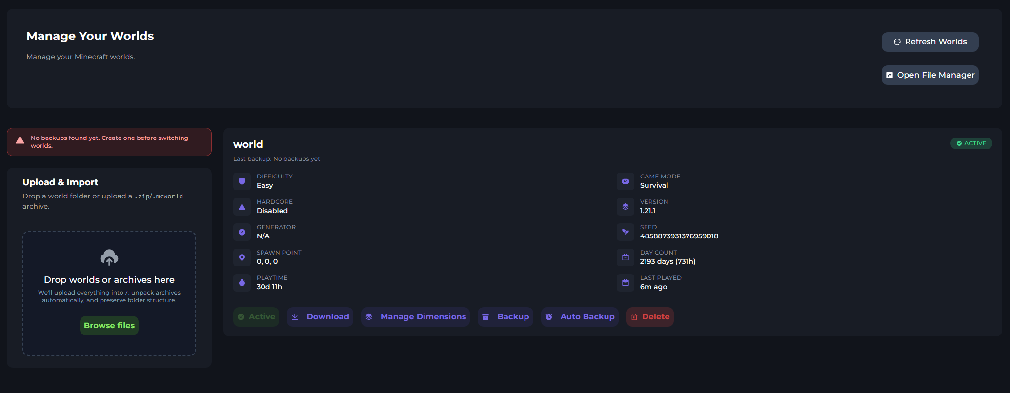 Here you can see the Manager panel. On the left, you can upload worlds & see past backups. It will also warn you if your world is not backed up.