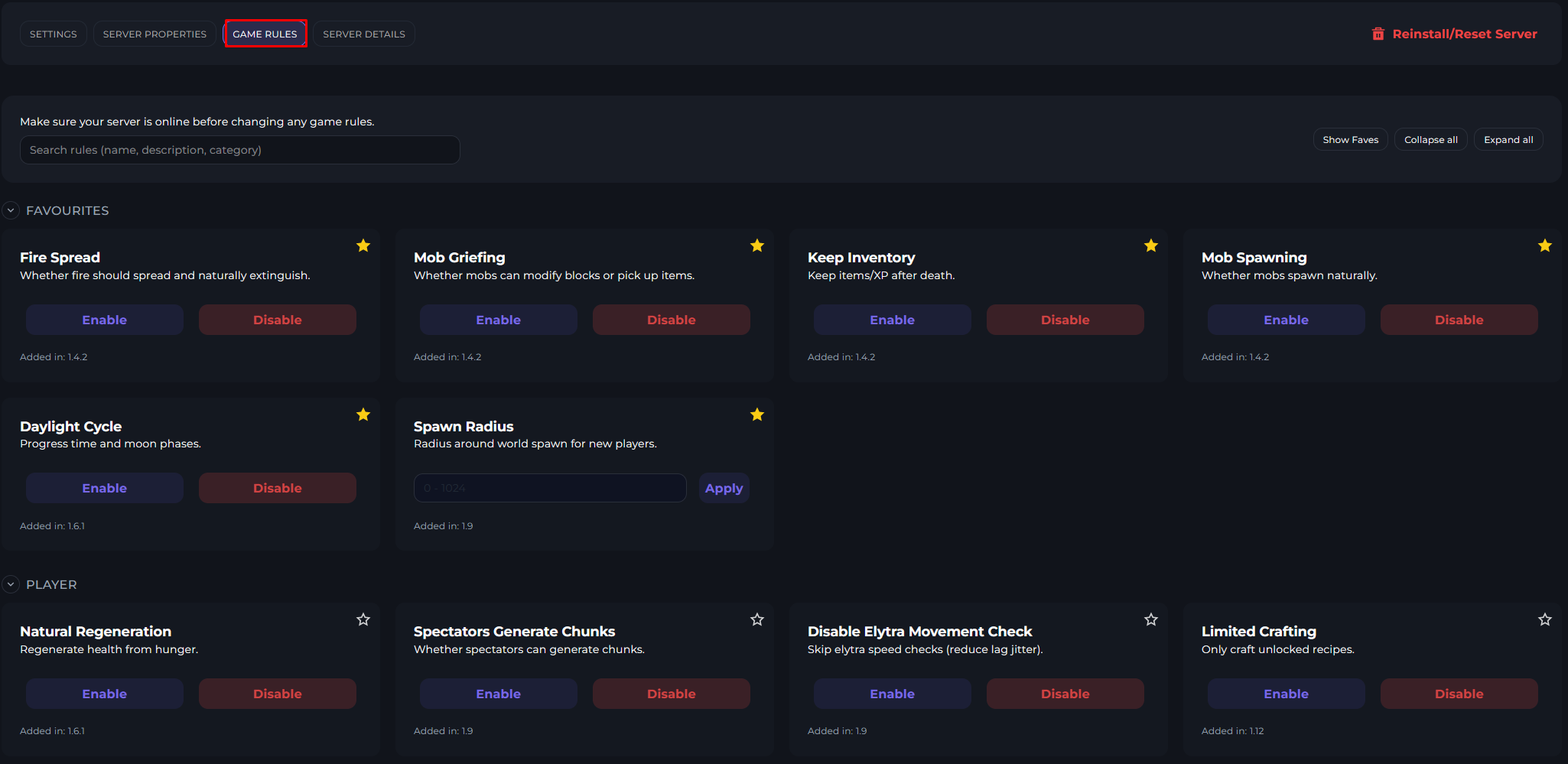 The Game Rules button will show a variety of Game Rules that you can do within your Minecraft Server, this will give details on when the Game Rule was added into Minecraft and what each one does. You can also click the Star Icon next to the Game Rule to mark them as a Favorite, which will ping to the Favorites tab.