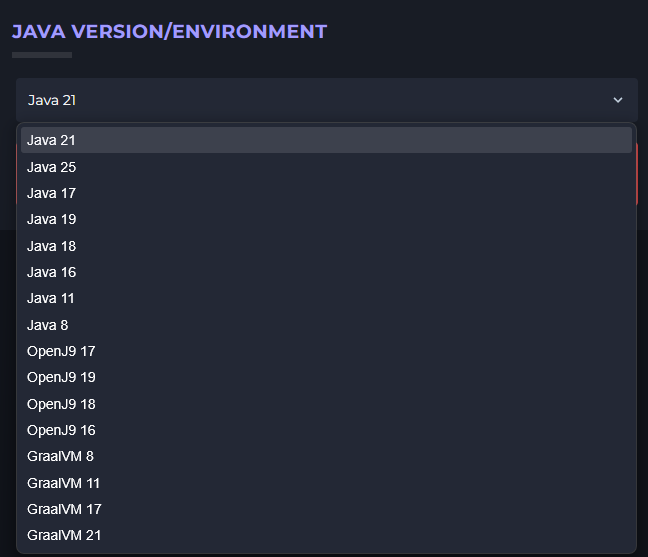 This is where you can change your Java Version/Environment for your Minecraft Server to your preferred one.