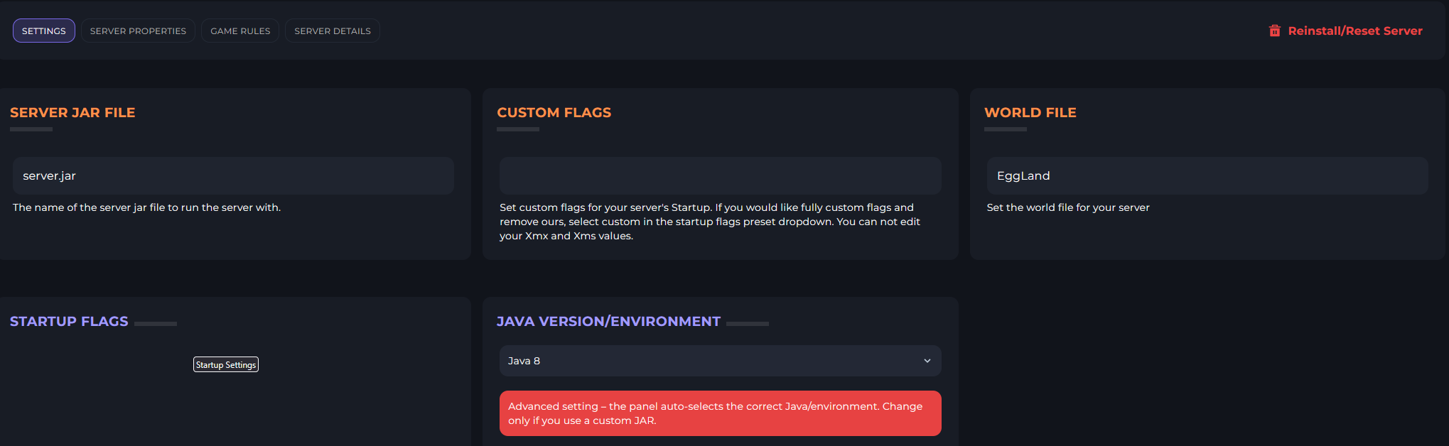 This is where you'll see the Server Jar, World File, Custom Startup Flags, Our Preset Startup Flags & The Java Version/Environment.