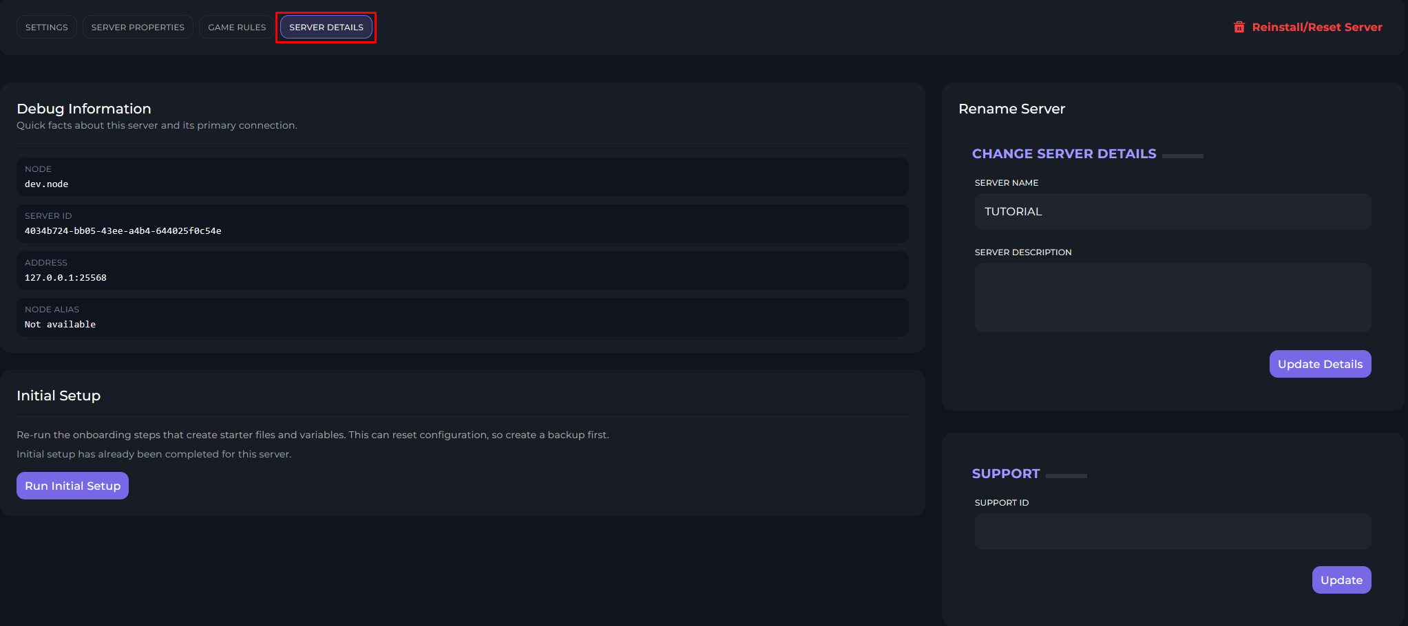 There are server details which will show the Node you are on, a longer version of your Server ID, Server Name & Description, Toggle the Initial Setup and enter your Support ID.