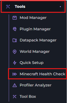 Go to the "Tools" drop-down on the left, and click "Minecraft Health Check"