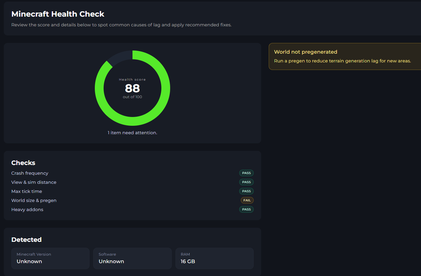 In the Health Check Menu, you can see all your server health information here. As you can see from my results, I've got my "World size and pregen" flagged.