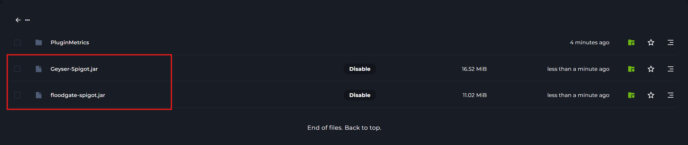noticeIf you do not see the Geyser-Spigot folder, it means that the server did not fully power on to generate the folders. You will need to turn the server on again.