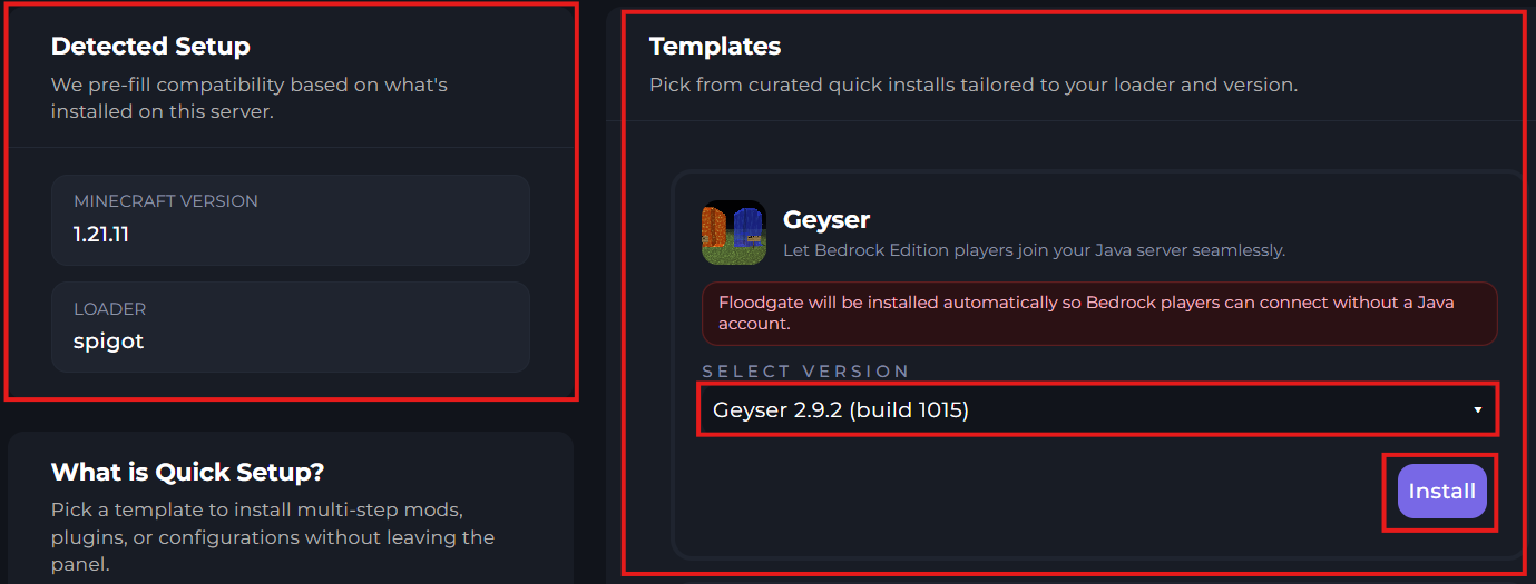 On the right side of the screen, you'll see an option to install Geyser, where you will need to select which version you need, then click "Install"noticeIf you do not see any results in the "Detected Setup" area, it means you don't have any loader installed on your server. You will need to install Spigot or Paper in order for Geyser to be installed.-1767639052330.png)