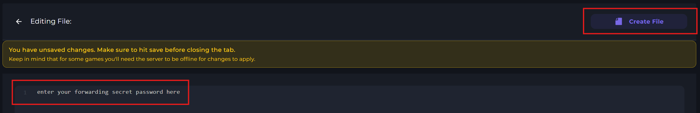 When creating the file, you'll need to input the forwarding secret password that Velocity gave you. Once you've entered the password, click "Create file" on the top right.