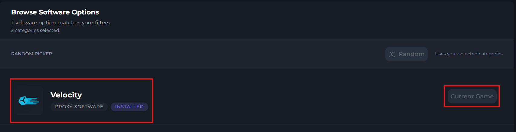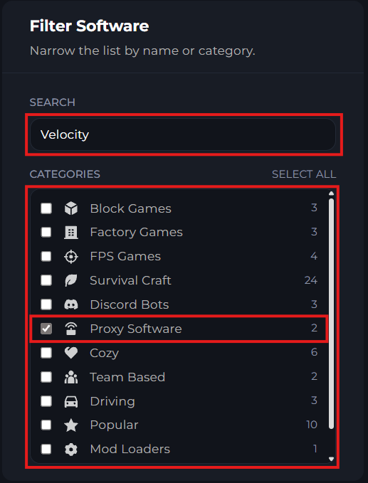 In this Change Game menu, you'll be able to search "Velocity" or check the category for "Proxy software's". You'll then see Velocity Proxy on the right side, where you can install it.