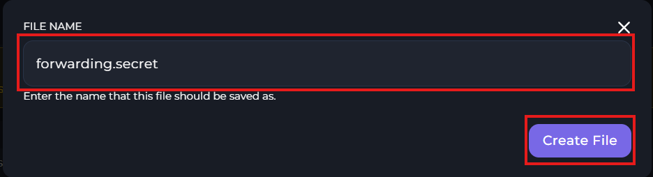 When setting the name for the file, you'll need to name it "forwarding.secret". Then click "Create File"