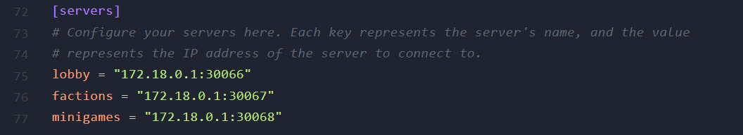 In the velocity.toml file, scroll down till you find the "servers" line. Here, you can rename the IP's to what you like. For the purpose of this guide, we will be keeping them as default.