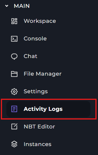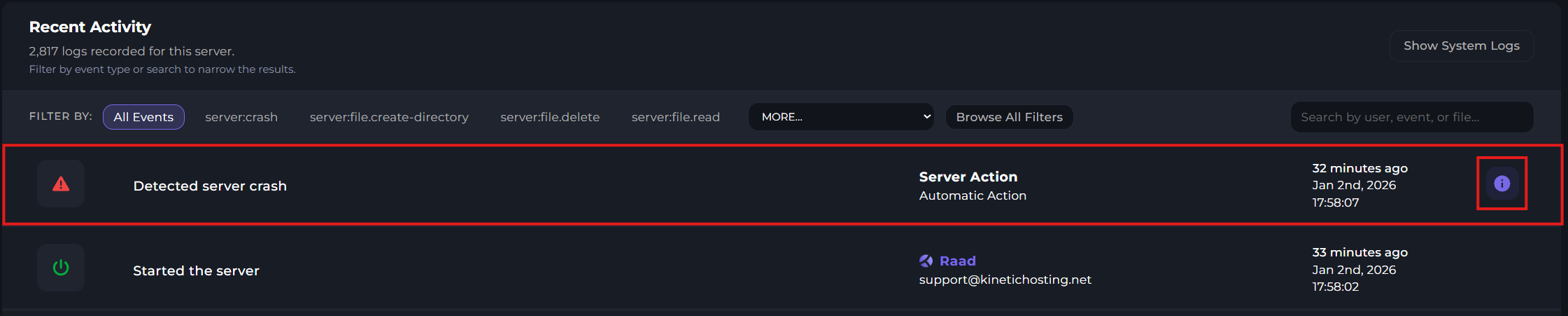 Once you open the activity logs, you'll be met with a screen like this; where you can view your most recent activities, which also include server crashes.