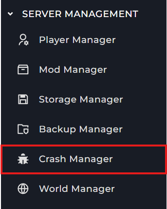 If your server keeps crashing, the best way to find a fix for it, is to either go to the "Crash Manager" section, or read your crash reports. To access the Crash Manager, you'll need to click the "Crash Manager" button of the left side of the game panel.