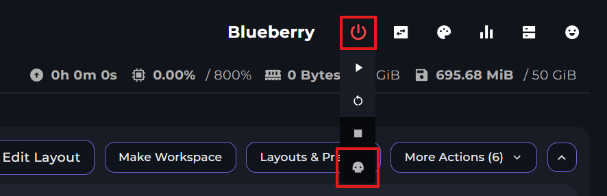 If a server is locked up, click on the power menu and you can kill your server by clicking on the skull icon.