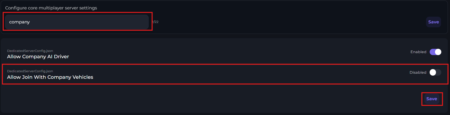 In the search bar, type "Company". Then, you can turn on the "Allow Company Vehicles" option. Once you've made the change, click "Save".