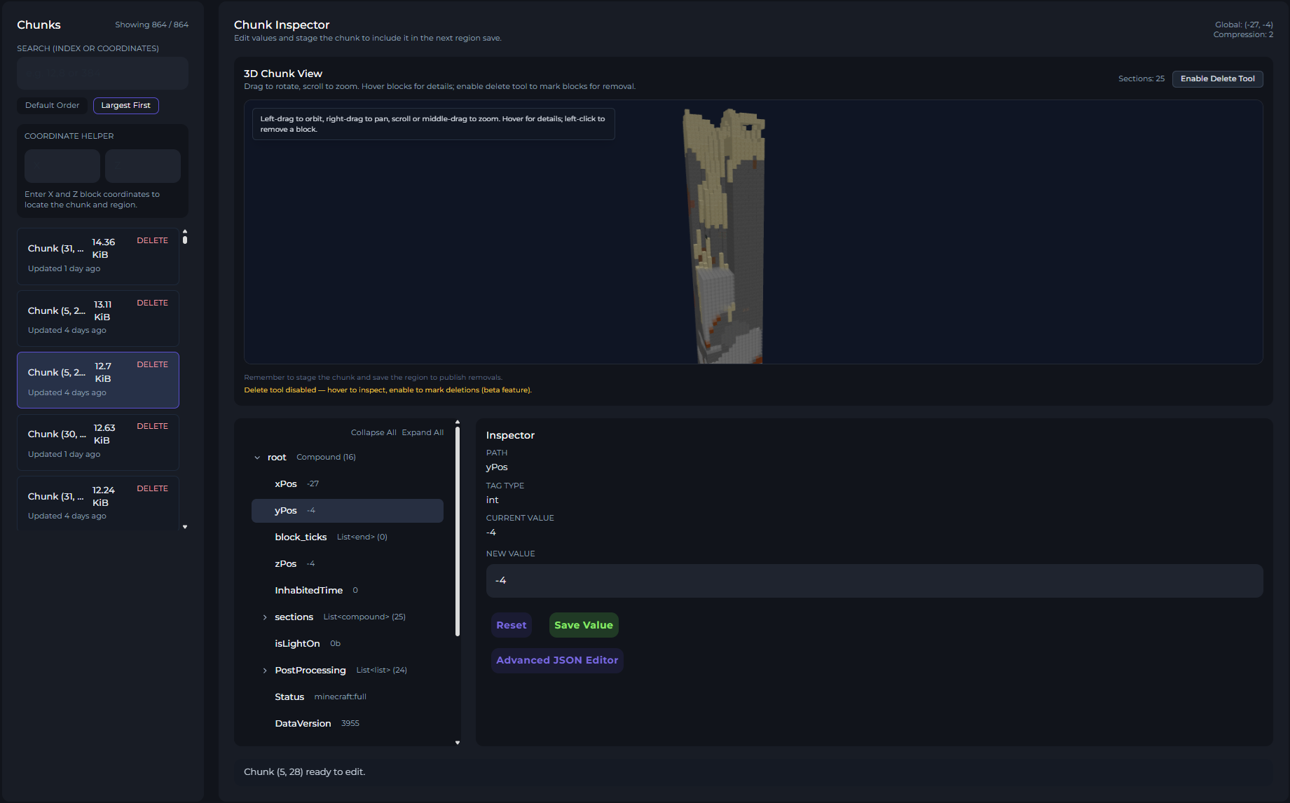 This is our 3D Chunk View, you can see the entire chunk and even edit the blocks, if you have a corrupt chunk, you can remove the corruption and save and continue.