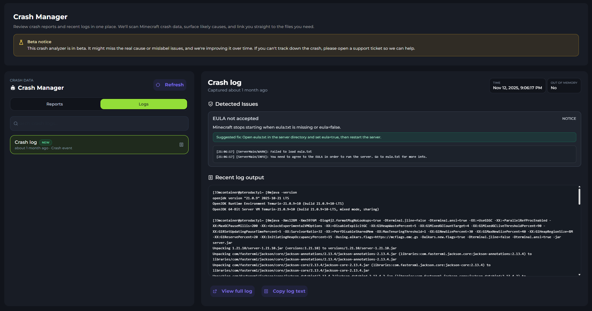 Though this feature is still in beta, it was worth showcasing due to how useful it will be, the Crash Manager will check your recent crash-log and parse the crash reason as close to correct as it can. This is not a fool proof solution yet as all server crashes have their nuance but as we get more information from crashes, the more correct the answers will get.