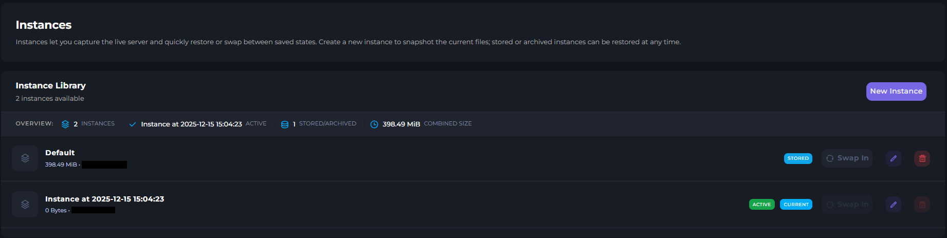 All | Instances | The Instances feature is very similar to Save States that you get in games, you are able to save a snapshot of your server in its current state, extremely useful for making changes or branching pathways in games! You can also use this feature to actively swap between games, saving your progress in one game. |