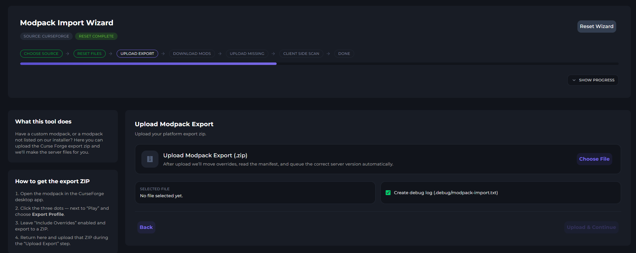 The Modpack Importer allows users to import Modpacks from Curseforge, if there is a modpack that we don’t currently have, you can upload it manually in a simplified way.