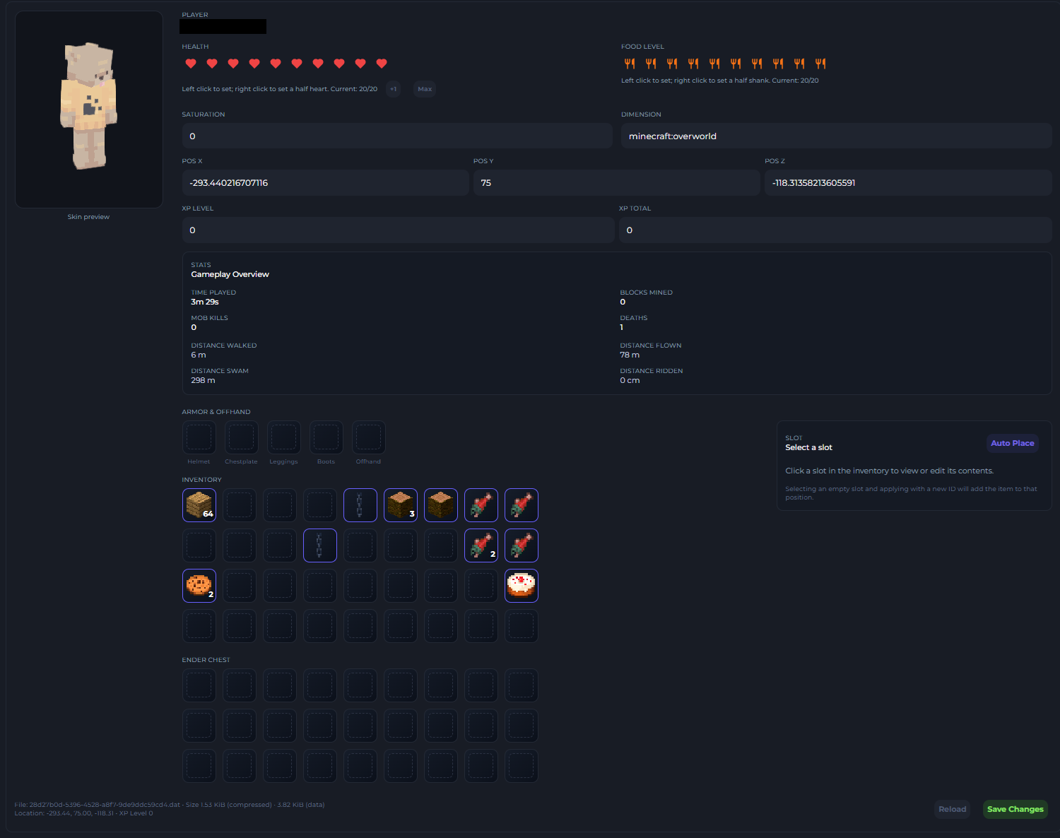 Similar to the 3D Chunk View, the Player Manager has a unique User Interface. The Player Manager allows you to see the user’s skin, inventory, enderchest, statistics and health/hunger. All of this information is editable and you can move items around in inventories.