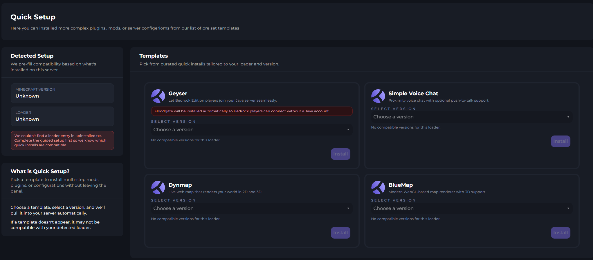 Minecraft (For Now) | Quick Install | The Quick Install feature allows the user to install Geyser, Simple Voice Chat, Dynmap or Bluemap with the port and plugin/ mod already configured. This feature will: Download the Plugin, start the server to create the config, set the config correctly and then restart the server. More Plugins/ Mods will be added to this feature over time for Minecraft and other games. |