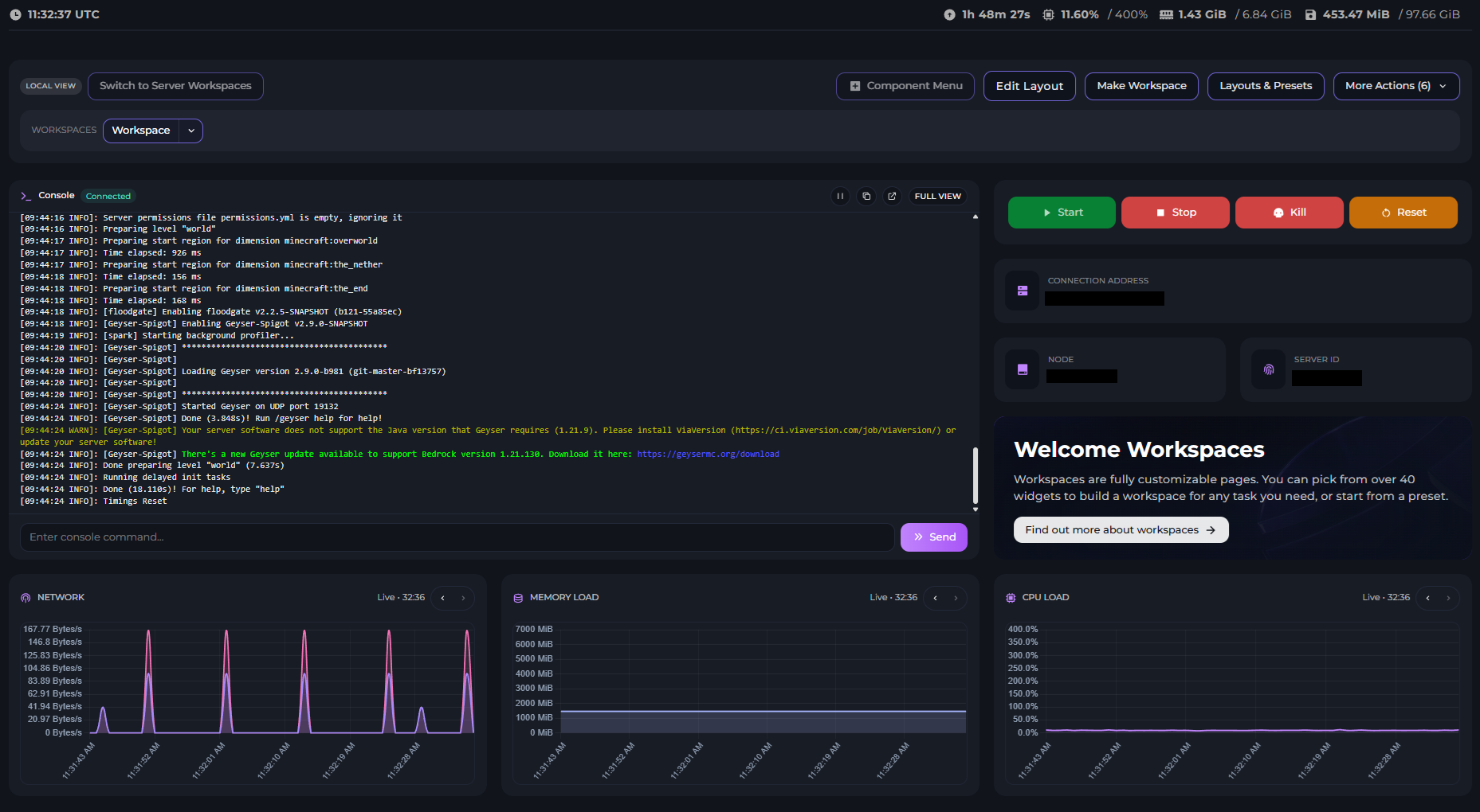 This is the “Workspace” Preset. This preset lets you see the Memory, CPU & Network Load, the Server Console and important server information.