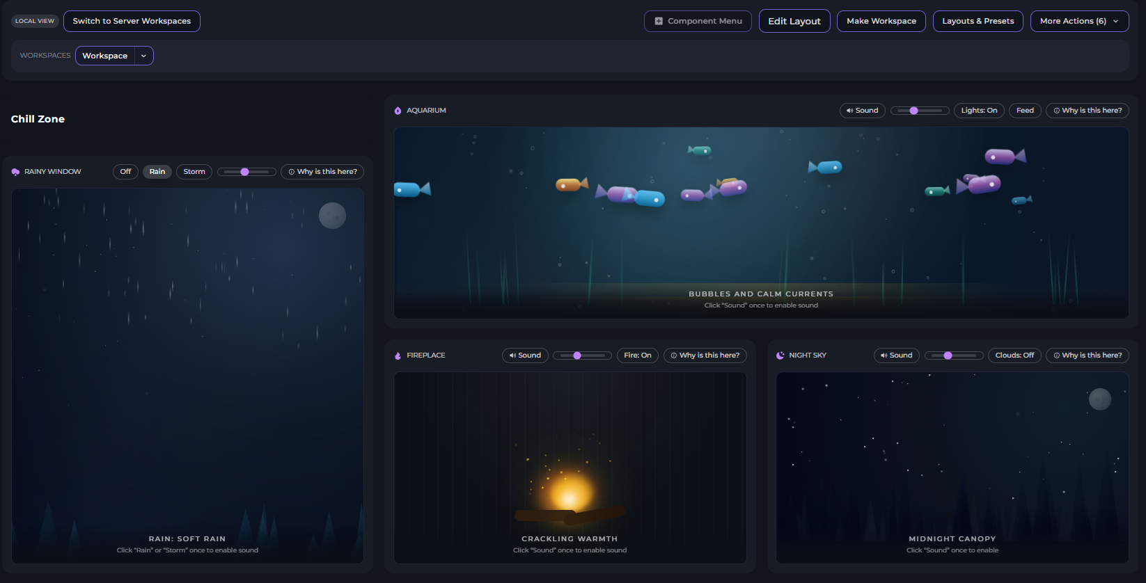 This is the “Chill Zone” Preset. This preset lets you sit and watch all of our calming, ambient widgets. This is one of the jokey workspaces we offer.
