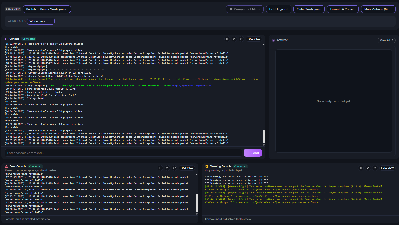 All | Workspaces | This is the main, biggest feature of Panel 6, you are now able to fully customise your panel layout, changing your experience to work the best for you, featuring 60+ widgets for the users to choose between. If editing the page feels like a long process, you don’t have to worry, we have presets that you may find work perfectly for you, custom made by our team. Customisability is a huge feature in Panel 6, we want our product to work for you, our customer, as you want it to. A huge piece of this feature is the ability to Pin Files, you can pin a specific section of the File Manager, such as the /mods directory, or the /plugins directory, allowing you to access them quickly from the main page of the Panel. The customisability doesn’t end there, you are also able to build out your own custom buttons, notes, add a page title and dividers, we’re really allowing the users to create an optimised workflow for themself or a team of server admins. |