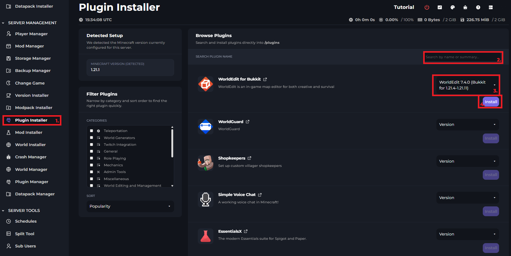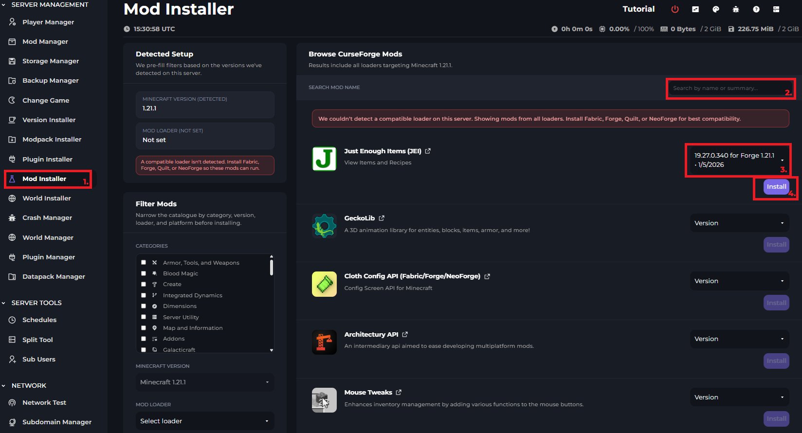 You can install mods on your server by going to the “Mod Installer” and searching for the specific mod you want, select the version and click “Install”, you can follow the below image.