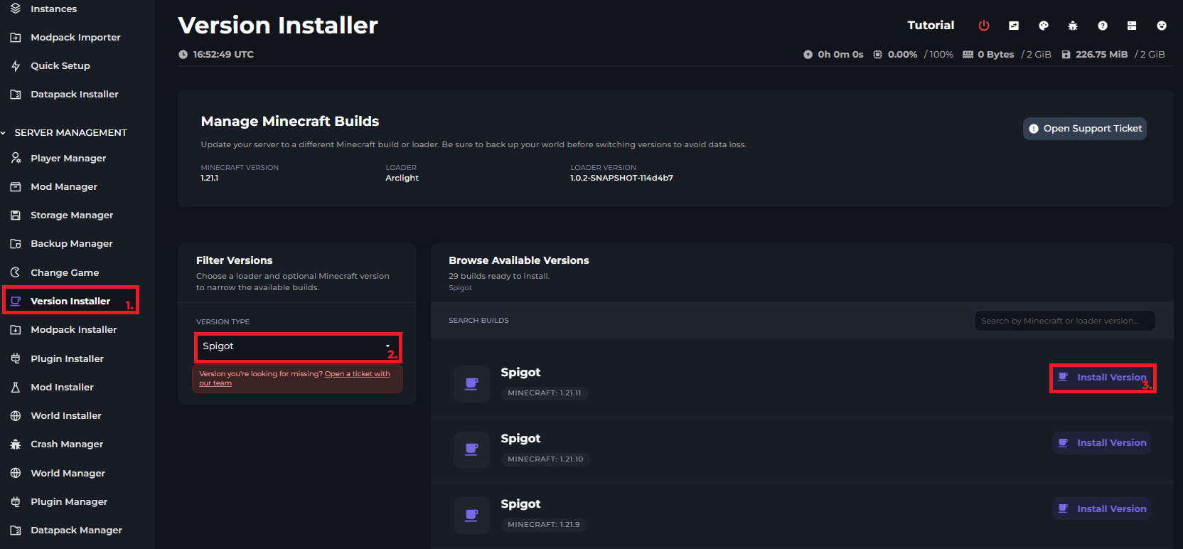 For the most part, we recommend that you use Spigot, this can be installed on the Kinetic Panel by going to the Version Installer, clicking the drop down on the left and selecting “Spigot” and Installing the version that you want. You can see where each button is in the image below.